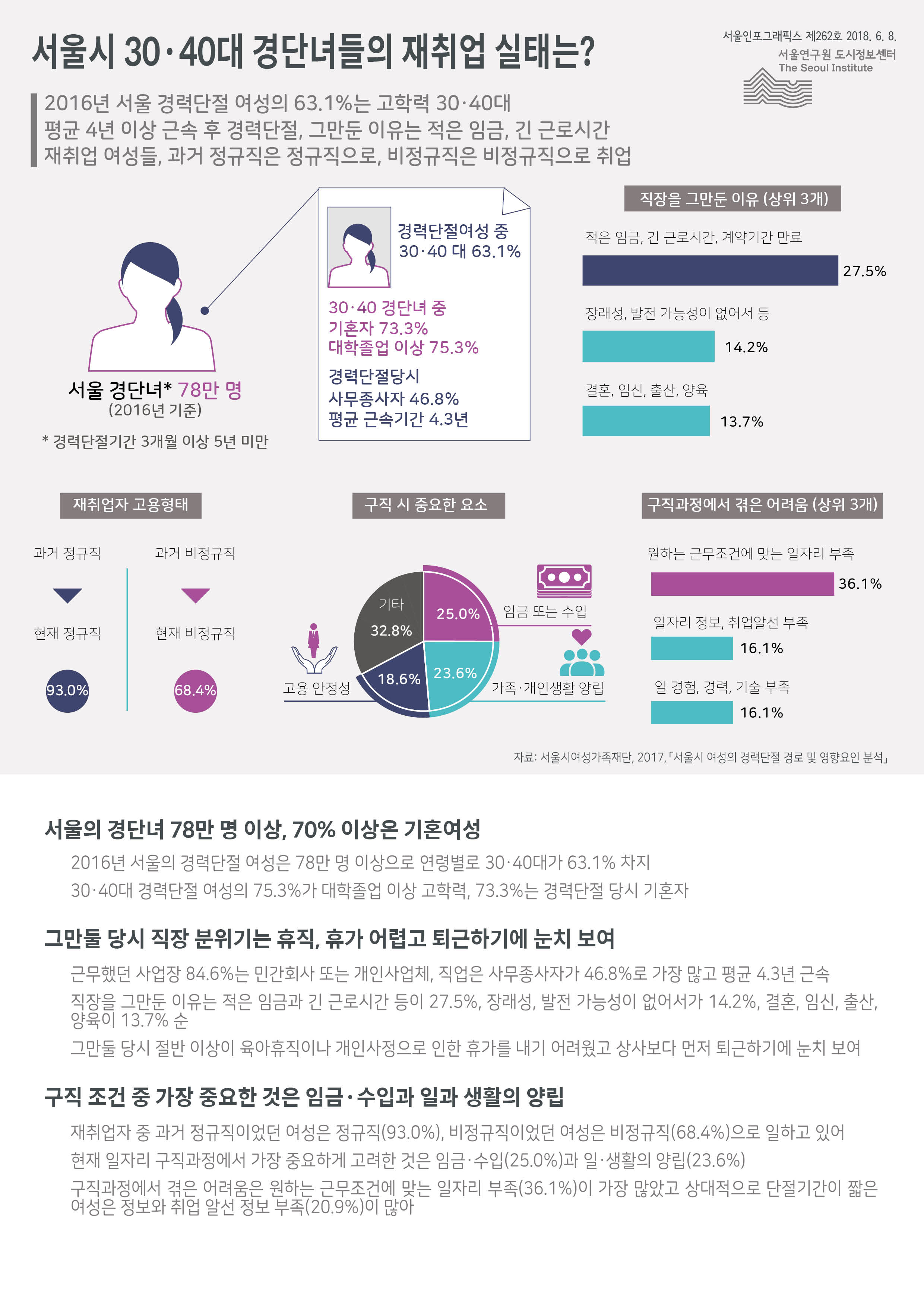 2016년 기준 서울의 경력단절여성(이하 경단녀)이 78만 명이 넘는 것으로 조사됐다. 연령별로는 30~40대가 63.1%를 차지했으며, 30~40대 경단녀 중 75.3%는 대학졸업 이상의 고학력자인 것으로 파악됐다. 이 중 기혼자가 73.3%였다. 이들은 평균 4.3년 근속했으며, 직장을 그만둔 이유는 적은 임금과 긴 근로시간(27.5%)이 가장 많았다. 재취업을 하는 데 가장 중요하는 고려하는 것은 임금・수입(25.0%)과 일・생활의 양립(23.6%)이었다. 구직과정에서 겪은 어려움은 근무조건에 맞는 일자리가 부족하다는 응답(36.1%)이 가장 많았다.