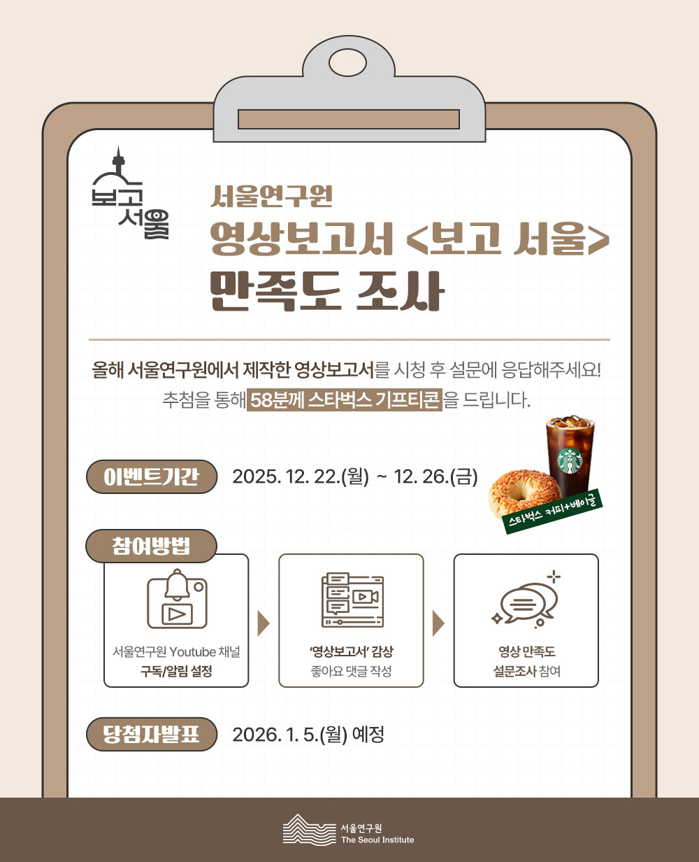 설문에 참여해 주신 분 중 추첨을 통해 소정의 선물을 드릴 예정이오니 만족도 조사에 적극 참여 바라며 서울연구원과 영상보고서 <보고 서울>에 많은 관심 가져주시기 바랍니다.